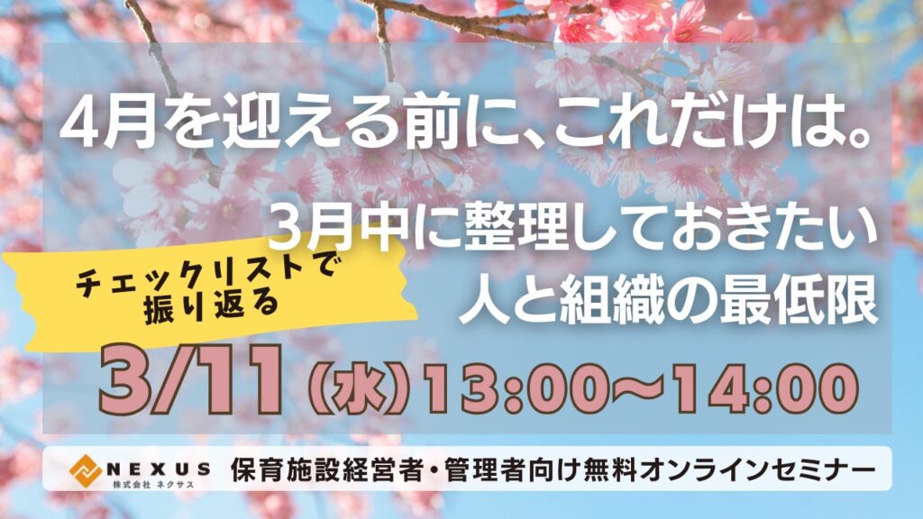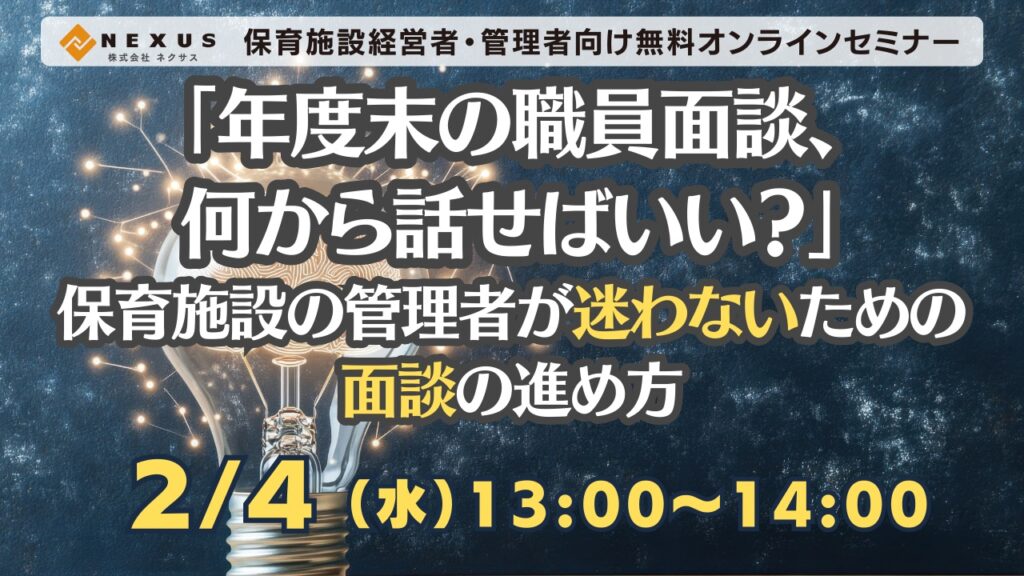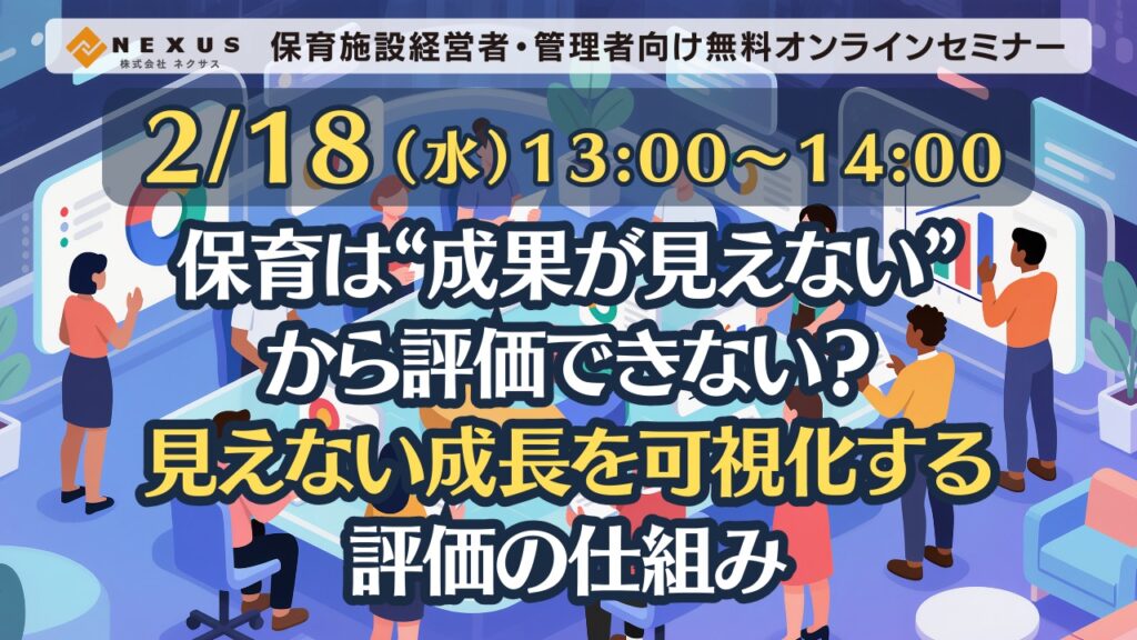 保育園経営者・管理者向け無料オンラインセミナー/成功例から学ぶ保育施設の評価制度セミナーは、ネクサスがこれまで制度設計をサポートをしてきた園の事例や、ネクサスの設計スタンス・ノウハウをもとに、保育施設にはどのような評価制度が実態に合うのか?を成功例を交えながらお伝えします。自園での設計のヒントが必ず見つかります。 -